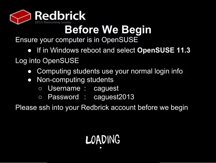 Before We Begin Ensure your computer is in OpenSUSE ● If in Windows reboot and select OpenSUSE 11.3 Log into OpenSUSE ● Computing students use your normal login info ● Non-computing students ○ Username : caguest ○ Password : caguest2013 Please ssh into your Redbrick account before we begin