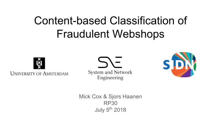 Content-based Classification of Fraudulent Webshops Mick Cox & Sjors Haanen RP30 July 5 th 2018