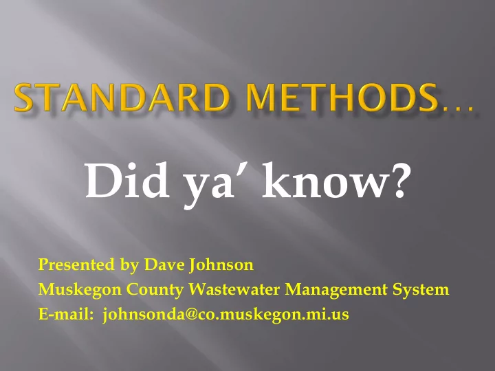 Did ya ’ know? Presented by Dave Johnson Muskegon County Wastewater Management System E-mail: johnsonda@co.muskegon.mi.us