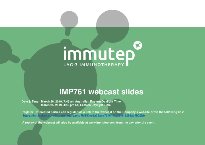 IMP761 webcast slides Date & Time: March 26, 2019, 7:45 am Australian Eastern Daylight Time March 25, 2019, 4:45 pm US Eastern Daylight Time Register: Interested parties can register via a link to the webcast on the Company’s website or via the following link: https://fnn.webex.com/fnn/onstage/g.php?MTID=e3a09aba7876417a76f919285ab7b26bb A replay of the webcast will also be available at www.immutep.com from the day after the event.