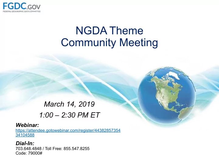NGDA Theme Community Meeting March 14, 2019 1:00 – 2:30 PM ET Webinar: https://attendee.gotowebinar.com/register/44382857354 34104588 Dial-In: 703.648.4848 / Toll Free: 855.547.8255 Code: 79000#