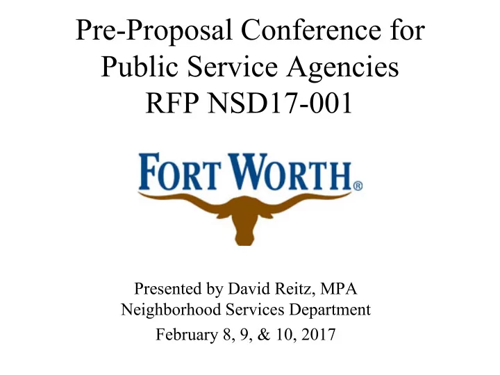 Pre-Proposal Conference for Public Service Agencies RFP NSD17-001 Presented by David Reitz, MPA Neighborhood Services Department February 8, 9, & 10, 2017