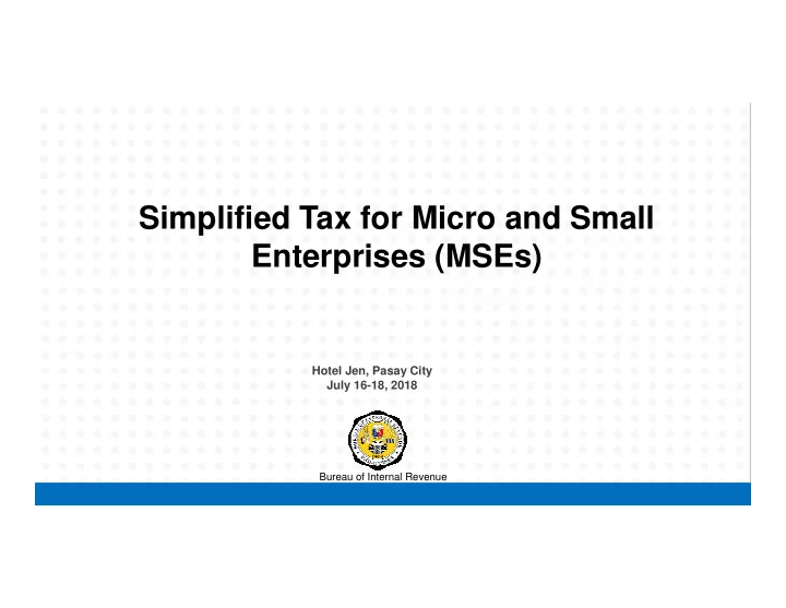 Simplified Tax for Micro and Small Enterprises (MSEs) Hotel Jen, Pasay City July 16-18, 2018 Bureau of Internal Revenue