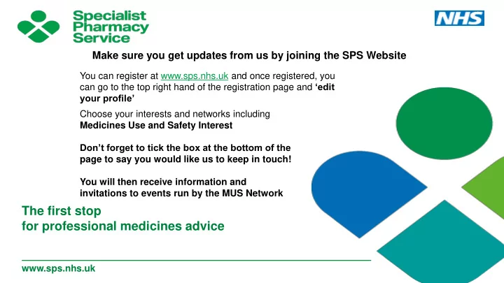 1. Make sure you get updates from us by joining the SPS Website You can register at www.sps.nhs.uk and once registered, you can go to the top right hand of the registration page and ‘edit your profile’ Choose your interests and networks including Medicines Use and Safety Interest Don’t forget to tick the box at the bottom of the page to say you would like us to keep in touch! You will then receive information and invitations to events run by the MUS Network The first stop for professional medicines advice www.sps.nhs.uk www.sps.nhs.uk