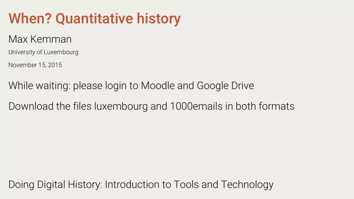 When? Quantitative history Max Kemman University of Luxembourg November 15, 2015 While waiting: please login to Moodle and Google Drive Download the files luxembourg and 1000emails in both formats Doing Digital History: Introduction to Tools and Technology