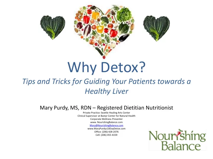 1. Why Detox? Tips and Tricks for Guiding Your Patients towards a Healthy Liver Mary Purdy, MS, RDN – Registered Dietitian Nutritionist Private Practice: Seattle Healing Arts Center Clinical Supervisor at Bastyr Center for Natural Health Corporate Wellness Presenter www. NourishingBalance.com Mary@NourishingBalance.com www.MaryPurdys10DayDetox.com Office: (206) 428-2076 Cell: (206) 455-4159